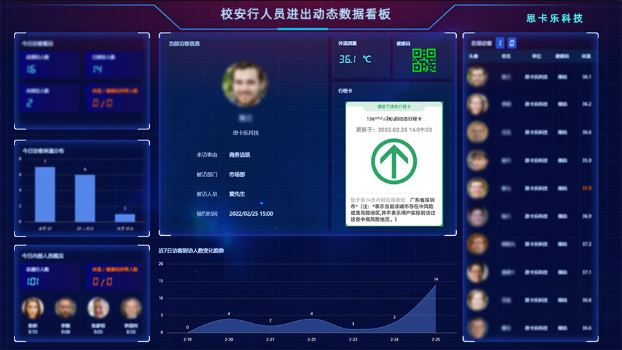 来访人员和学校管理人员在微信平台里申请、审批。访客到达学校后,首先进行“人、证合一验证”,同步自动完成各项健康检查,不仅杜绝冒名顶替,更第一时间将风险阻挡在校门之外。通过“分类、分区、分级”管控,进一步构筑了精准、严密的校园防控体系。系统所有数据实时存储,自动统计、分析,既方便管理人员实时掌握校园内人员流动情况,当出现突发事件时,还能够溯源调查,有利于快速、准确地处理相关问题。